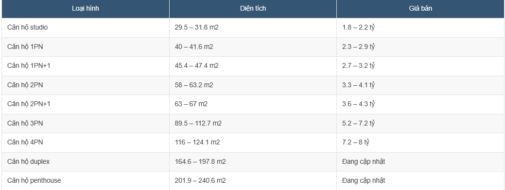 Loại hình: Studio, 1PN, 1PN+1, 2PN, 2PN+1, 3PN, 4PN, Duplex, Penthouse